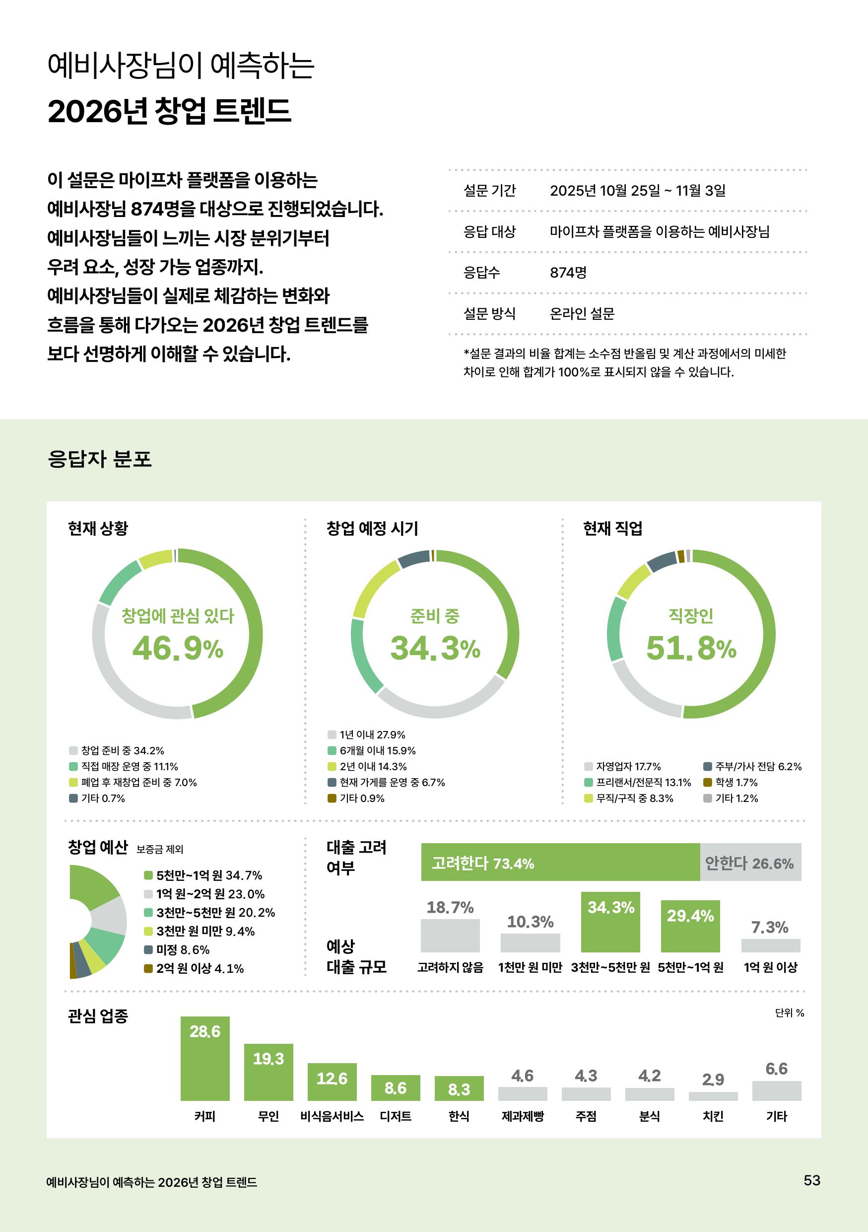 2026년 창업 시장의 분위기는 어떨까요? 마이프차는 2026년 창업 시장 예측을 위해 마이프차 서비스를 이용하는 874명의 예비사장님을 대상으로 설문조사를 진행했습니다. 불확실성이 점점 더 커져가는 흐름 속에서 예비사장님들이 선택한 2026년의 생존 키워드는 무엇일지, 그리고 그들이 가장 주목하고 있는 유망 업종(커피, 무인 등)은 무엇인지 리포트를 통해 자세하게 확인할 수 있어요.