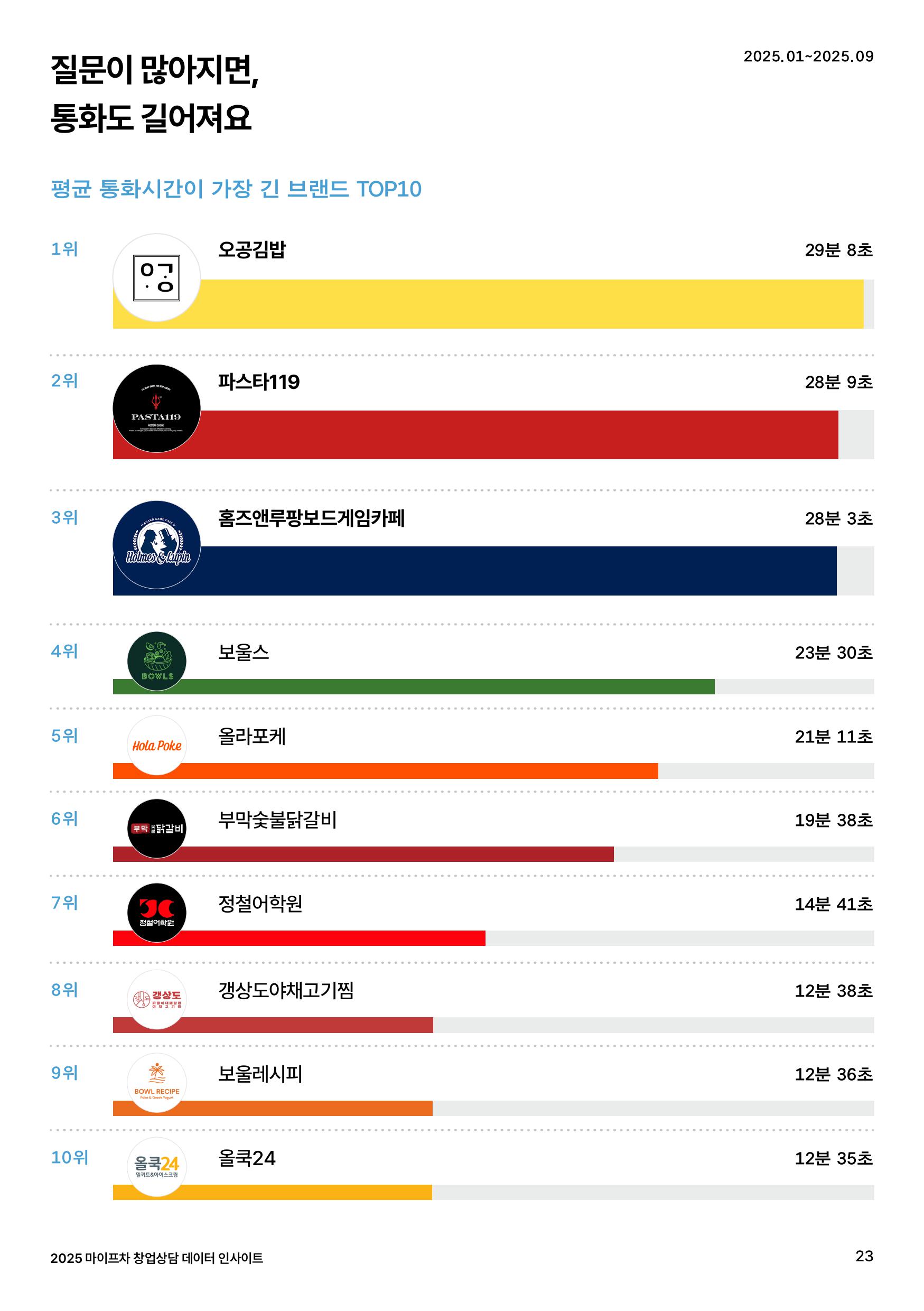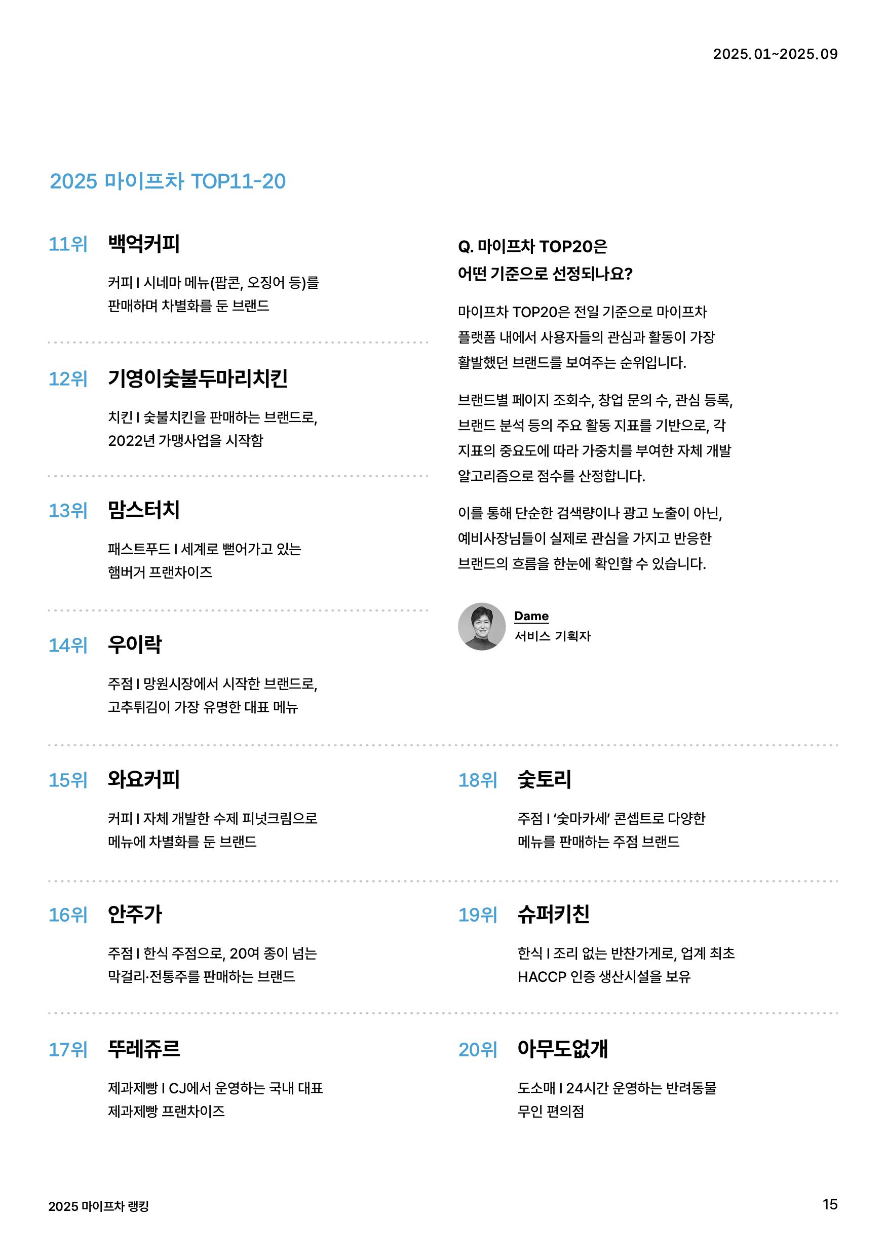 조회수와 창업 문의를 모두 잡은 1위 브랜드는? 리포트를 다운로드 받으면 2025년 예비사장님들의 관심도가 가장 높았던 20개 브랜드와 함께 브랜드 페이지 조회수 TOP 브랜드, 창업문의 TOP 브랜드를 알 수 있어요. 마이프차가 자체 개발한 알고리즘을 통해 선정된 올해의 프랜차이즈 TOP 20. 2025 마이프차 랭킹을 통해 어떤 프랜차이즈 브랜드가 작년 한 해 큰 사랑을 받았는지 확인해보세요.