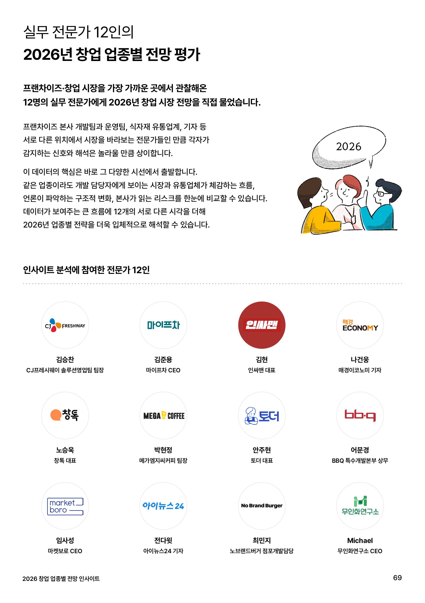 숫자 너머의 진짜 흐름을 파악하기 위해, 마이프차는 창업 시장 가장 가까운 곳에서 활약 중인 실무 전문가 12인에게 2026년의 전망을 직접 물었습니다. 서로 다른 위치에서 감지한 12가지의 시선을 더해, 내년 창업 시장을 더욱 입체적으로 분석했어요. 전문가들이 공통적으로 꼽은 2026년 창업 트렌드 키워드는 무엇일까요? 전문가들의 인사이트가 담긴 업종별 전망을 리포트에서 확인해 보세요.